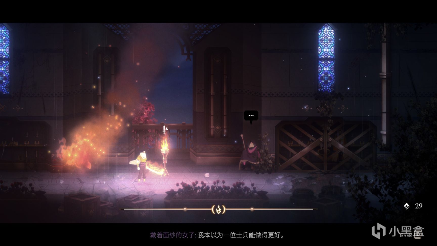 这款游戏没有任何新手指引,玩法和机制全靠玩家自己摸索和理解。当第一次看到火炬的时候,我是很茫然的。当主角手中的刀与火炬的火焰接触之后也被点燃,并出现一个火焰熄灭的计时条的时候,我才意识到,火在这款游戏里扮演着重要的角色。