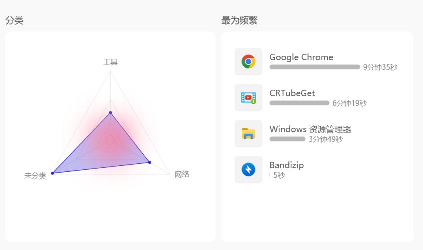 在侧边的项目里,还可以看到一个多边形的占用统计图,它可以告诉你,你用得最多的软件是哪一类,是花在编程或者学习的时间多,还是游戏娱乐的时间比较多。