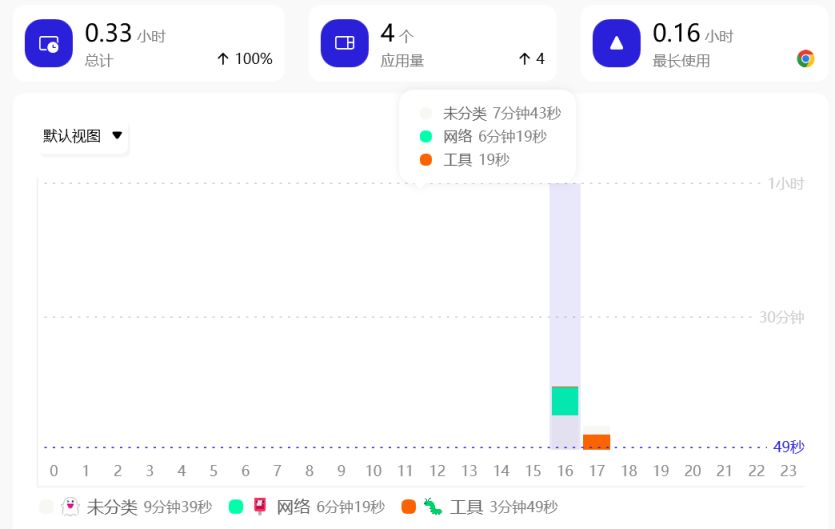 每天的使用,统计分析的范围可以是每个小时,可以说是记录得非常详细了,在很久之后,你甚至能找出你某一天的某个小时,用得最多的软件是哪一个。