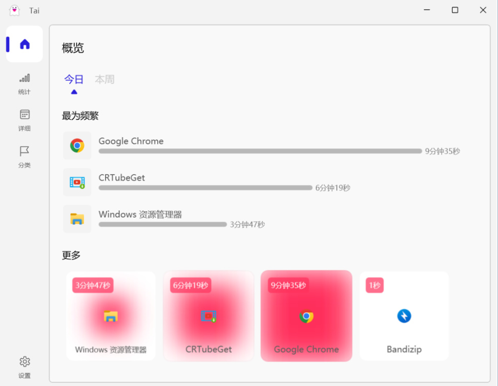 今天我们体验的软件,是一款免费开源的软件使用时间记录工具-Tai,它是小巧轻量的,会在后台帮你统计“软件从获得焦点时开始到失去焦点后这段时间,而不是软件的存活时间。”最主要的是,这款小工具颜值也还不错,看上去简洁又实用。