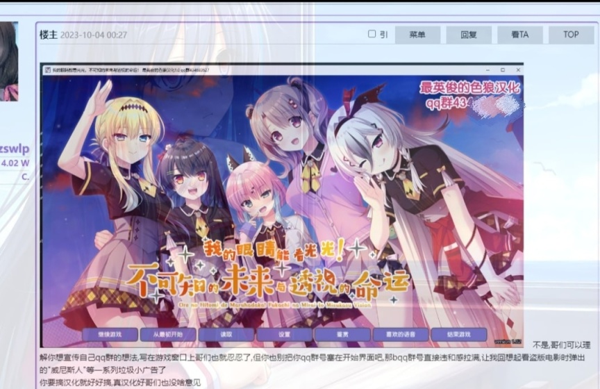 起因是英俊(这个是简称)在做了时停社新作《透视瞳》的汉化补丁时,在游戏右上角塞了一个文本,上面标注了是自己汉化,然后加了个群号。
