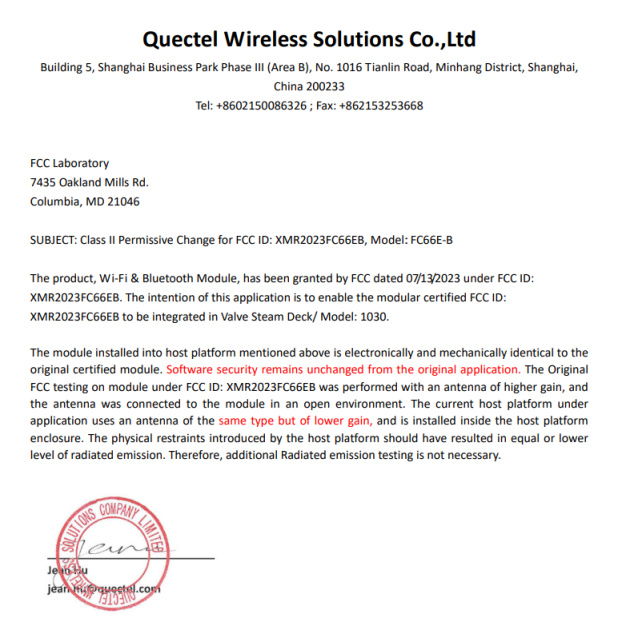 上海移遠提交II 類許可變更,在新款 Steam Deck 上使用經過認證的 Wi-Fi 6E 和藍牙芯片 FC66E,這款無線芯片已經通過了認證,不需要對新款 Steam Deck 進行額外認證。