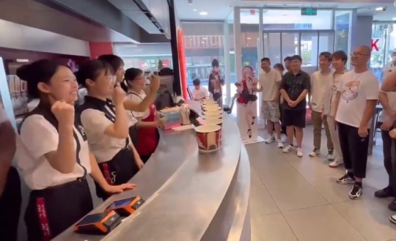正如前面提到的多樣化的活動安排,喊口號的部分看起來已經足夠腳趾扣地了,而在設置了對暗號環節的主題店,KFC店員甚至也做了相關培訓,會對玩家的口號做出固定回應。