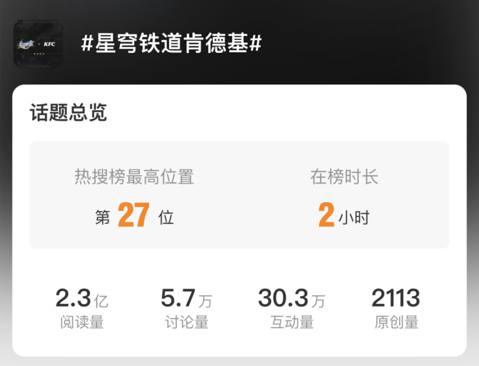 簡明洗腦的口號或主題,多樣化的內容流程設置,以及“官方下場”的姿態……這些是《星穹鐵道》能做好這次聯動的先決條件。而後由官方整活帶動玩家參與,再由他們分享、傳播出去,形成了大量的內容產出和消費,最終佔領多個熱搜、構成活動的閉環。這是一場完整聯動的核心思路,此前《原神》 x KFC傳播較廣也是同理。