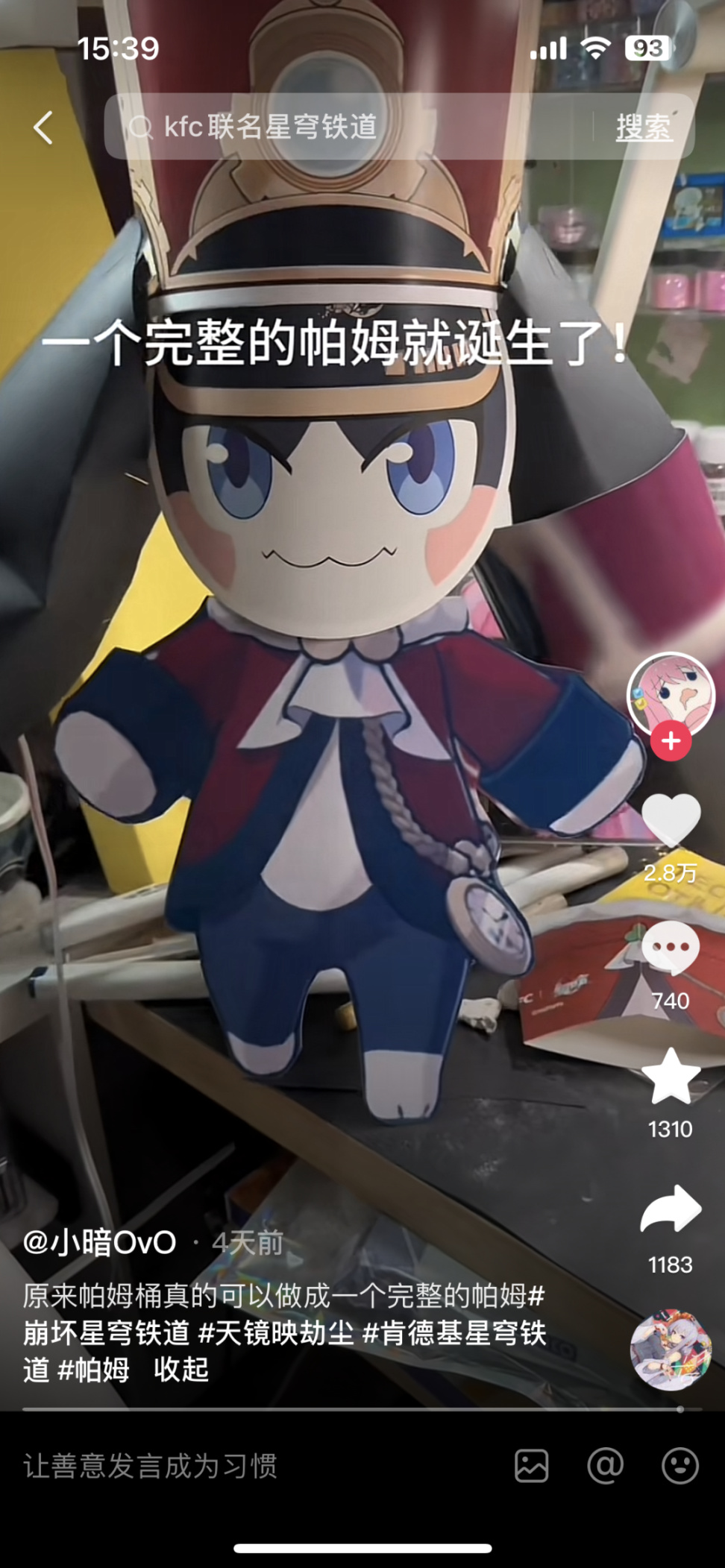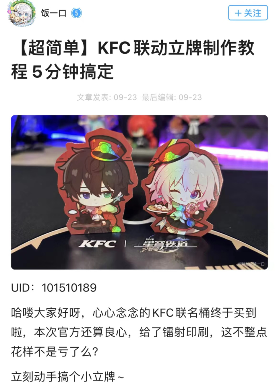 除此之外,這次《星穹鐵道》和KFC聯動的一些細節設計上,也考慮得比較周全。肯德基的員工做好了相應的培訓,不在紙桶裏放食物,讓玩家能拿到完整乾淨的周邊,以便玩家將聯動套餐的桶設計成各種各樣的周邊物料,比如立牌樣式的擺件,或是自成一體的帕姆。