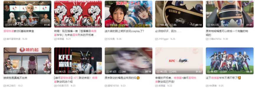 其二是活動力度。這次《星穹鐵道》與KFC的聯動範圍廣、時間長,全國參與活動的主題店有254家,持續近1個月時間。這種聯動覆蓋和持續,也給玩家、UP主等各類作者的UGC內容產出留足了空間。