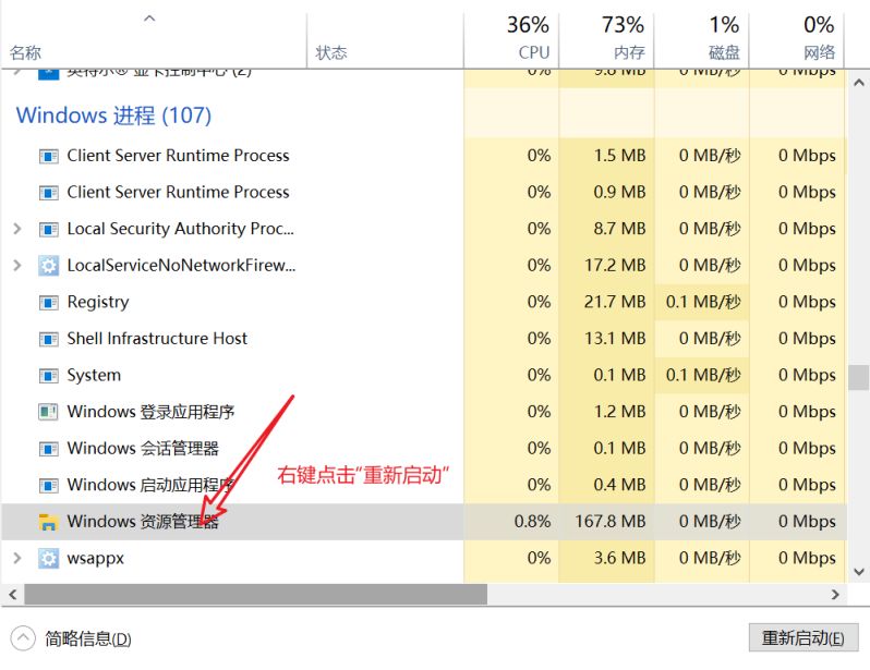 3.Ctrl+Shift+ESC打开任务管理器,选择“Windows资源管理器”,右键点击“重新启动”