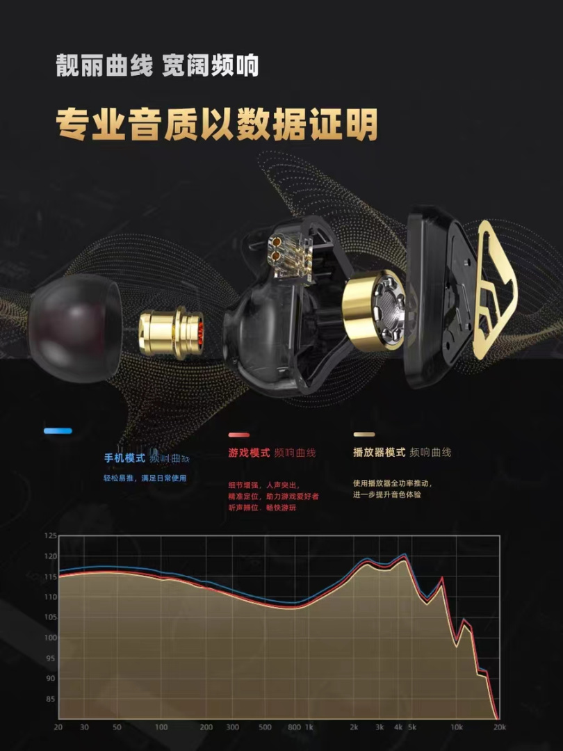 耳机都有两个拨动开关,三种调音模式对应着游戏/手机/播放器三种使用场景。手机模式下,耳机的高频会更突出,满足日常使用;播放器模式(HiFi)低频会增强,人声圆润不刺耳,中高低频更加均衡,搭配大推力播放器或者耳放,日常听歌推荐播放器模式;游戏模式会突出特定频率的声音,例如脚步声枪声。