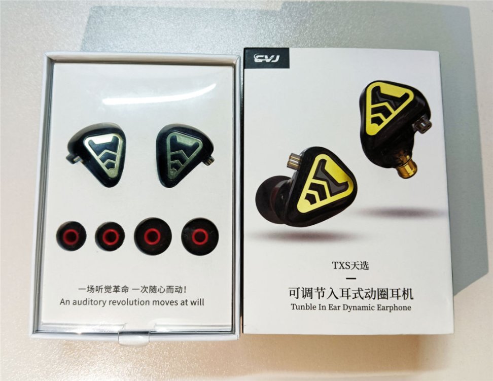 相比于CVJ可诺卡,天选的外包装比较简约小巧。一只手掌大小的外盒,抽拉式设计,防撞泡沫包裹着一对耳机单元和两对尺寸不一的替换耳套,正下方则是CVJ品牌slogan:一场听觉革命 一切随心而动。塑料盖板边缘有一个延伸出来的塑料片,方便我们打开盖板。此外,耳机线材、说明书、合格证、保修卡以及一根卡针就是全部配件。