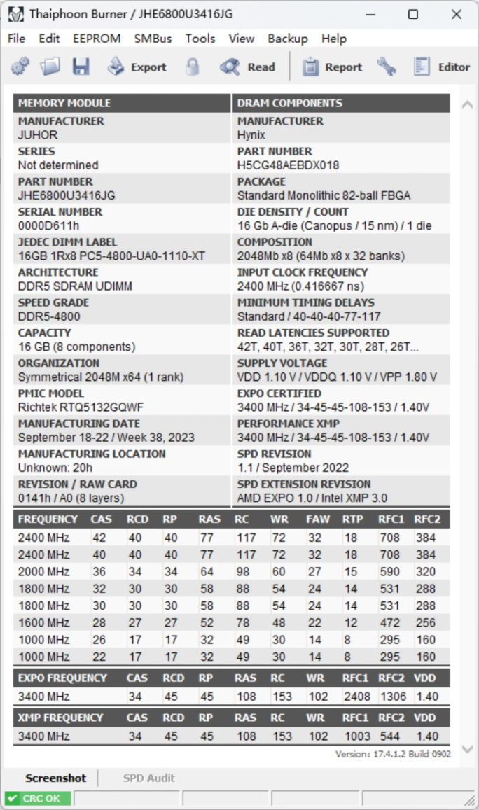 通過Thaiphoon Burner軟件可以看到星舞系列 DDR5 6800MHz 32GB(16Gx2)套裝的時序爲CL34-45-45-108,默認電壓爲1.4V,採用海力士A-Die顆粒,顆粒型號爲:H5CG48AEBDX018,單面雙列直列式封裝,具有8顆組成16GB容量,支持AMD EXPO 1.0 /Intel XMP 3.0。