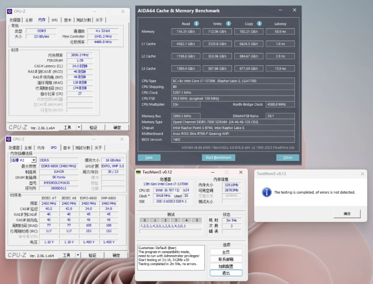 作爲一款採用海力士原廠A-Die顆粒的產品,不超頻等於浪費。在通過7200MHz,7400MHz,7600MHz後,最終在1.49V,34-46-46-128時序下達成7800MHz,讀寫雙雙破110GB/s達到116.35GB/s和 112.06GB/s,延遲也降低到了58.9ns,性能提升明顯。我也嘗試過8000MHz,能進系統,但是TM5測試報錯,如果換成Z790的板子,上8000Mhz應該沒什麼問題。