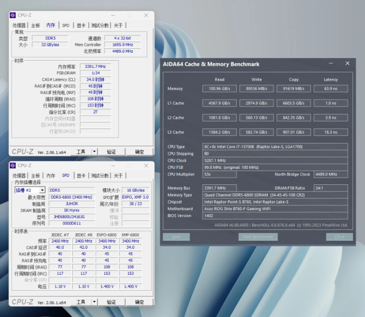 本次測試的平臺採用13700K+ROG B760F的組合,首先開啓XMP,直接上到6800MHz,在AIDA64的內存測試中可以看到,讀取成績爲破100GB/s,寫入成績達到89536MB/s,延時爲63ns,表現穩定。