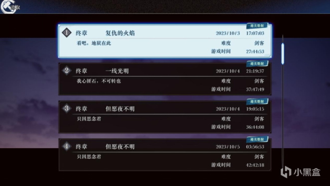 其中,一周目(存档1)“复仇的火焰”结局用了28小时,二周目(存档3 继承通关数据)“但愿夜不明”存档游戏时间37小时,三周目(存档2 读与武藏决斗之前的档)“一线光明”存档游戏时间38小时,四周目(存档4 继承存档2)“但愿夜不明”存档游戏时间43小时,再加上一些脑子没回过弯走的弯路(包括但不限于读档打半天才发现存档不对)和后续补全一些大江湖营生耗费的时间,按照这个“剑鬼是不可能剑鬼的,是这辈子都不可能开剑鬼难度”的全程剑客难度的打法,我的最终白金时长是50.7小时。
