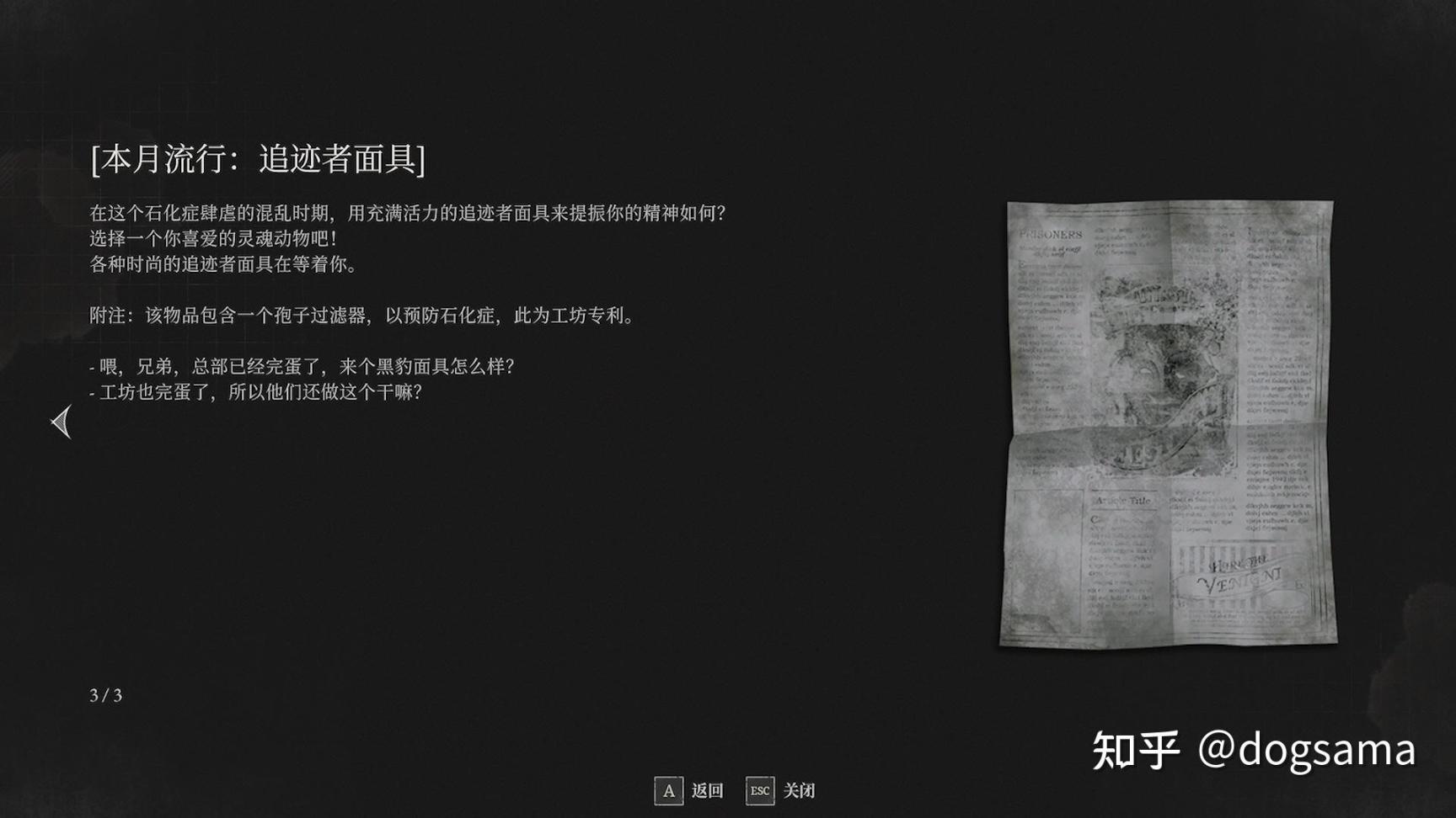 你同样可以在《追迹者面具》里看到对孢子感染的再次强调:“该物品包含一个孢子过滤器,以预防石化症。”