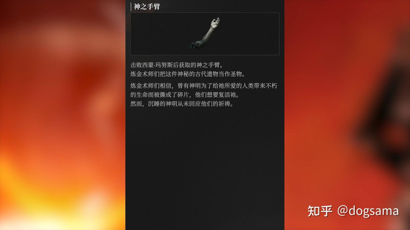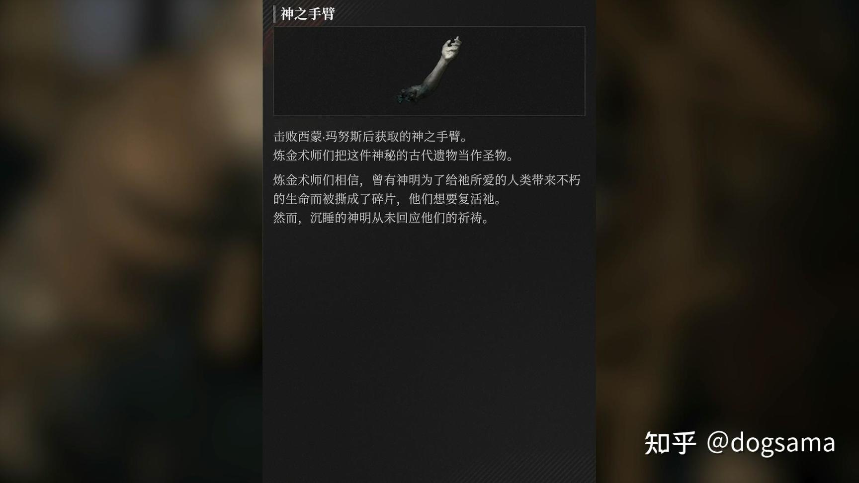 杀死西蒙后,你会得到一个奇怪的物品《神之手臂》上面写道:“炼金术师们相信,曾有神明为了给祂所爱的人类带来不朽的生命而被撕成了碎片,他们想要复活祂。然而,沉睡的神明从未回应他们的祈祷。”
