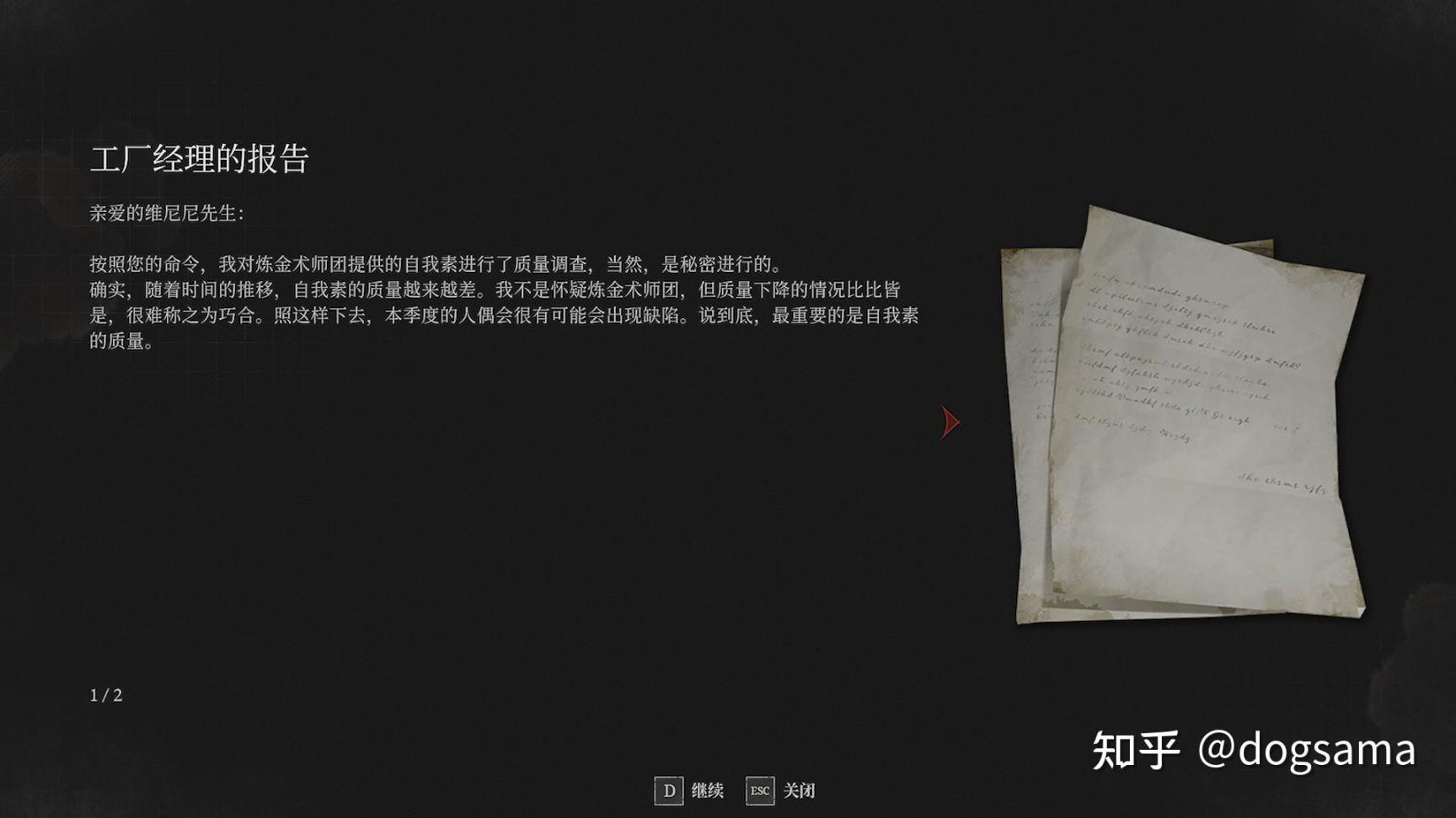 一条是女仆人偶卡米尔,觉醒之后的她,请求炼金术师让她回到自己的孩子身边,但是她得到的结果却是被无情的肢解,甚至被炼金术师看成了可以通达真理的工具,在文档里如此写道:“通过审讯和拆解卡米尔,教团打开了通往新的可能的大门。后来,出现了大契约等控制手段,但与这个发现相比,这只是一个小问题。自我素不只是一个能量石,它还包容了生命。通过自我素,我们可以打开通往永恒生命的大门。觉醒、进化、飞升。有了这个发现,人类将实现永生。”