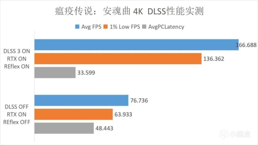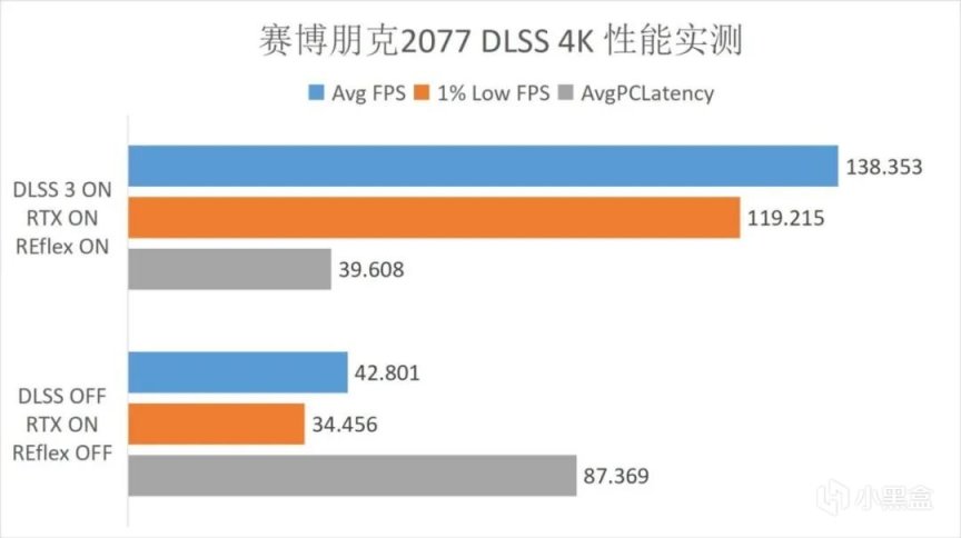 开启DLSS3后,可实现游戏平均FPS和1% Low FPS的游戏帧数翻倍提升。