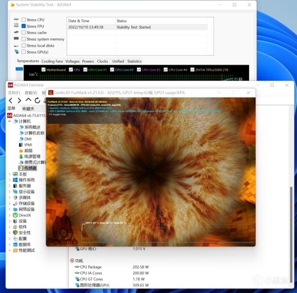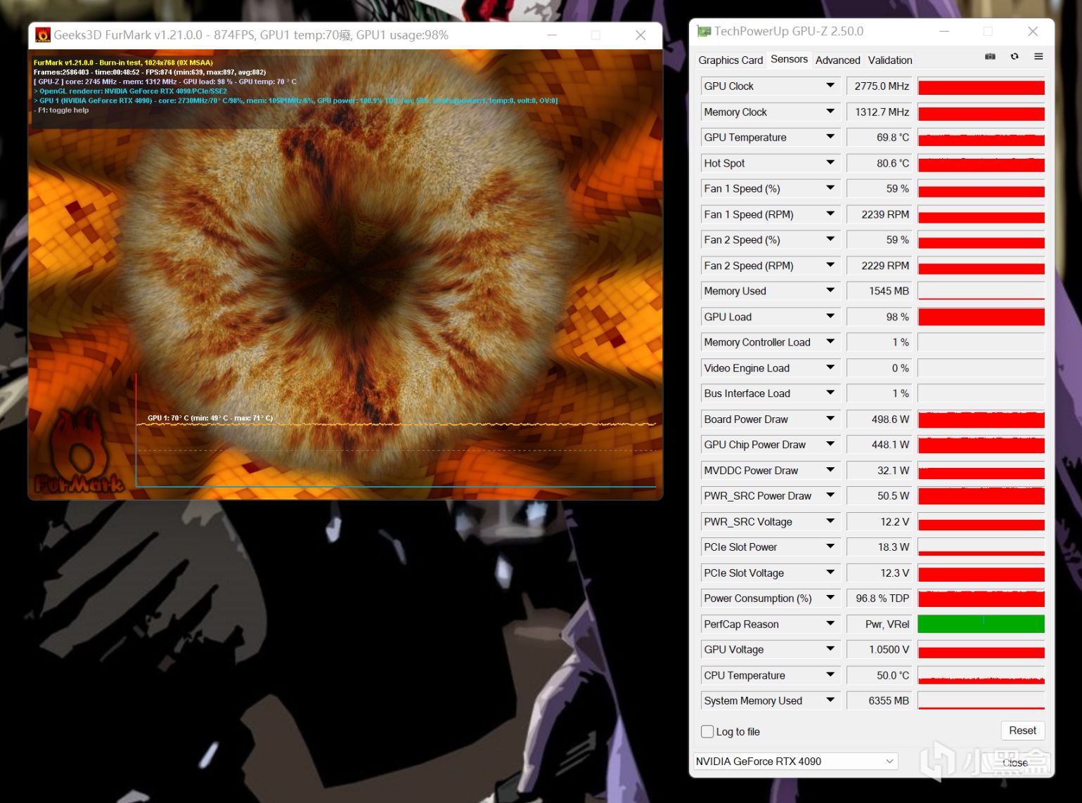 室温24度,机箱不是开放式的测试场景,。Furmark烤机显卡测试48分钟,显卡最高69.8度左右,风扇转速2239RPM左右,功耗在500W左右,GPU核心频率2775MHz左右。