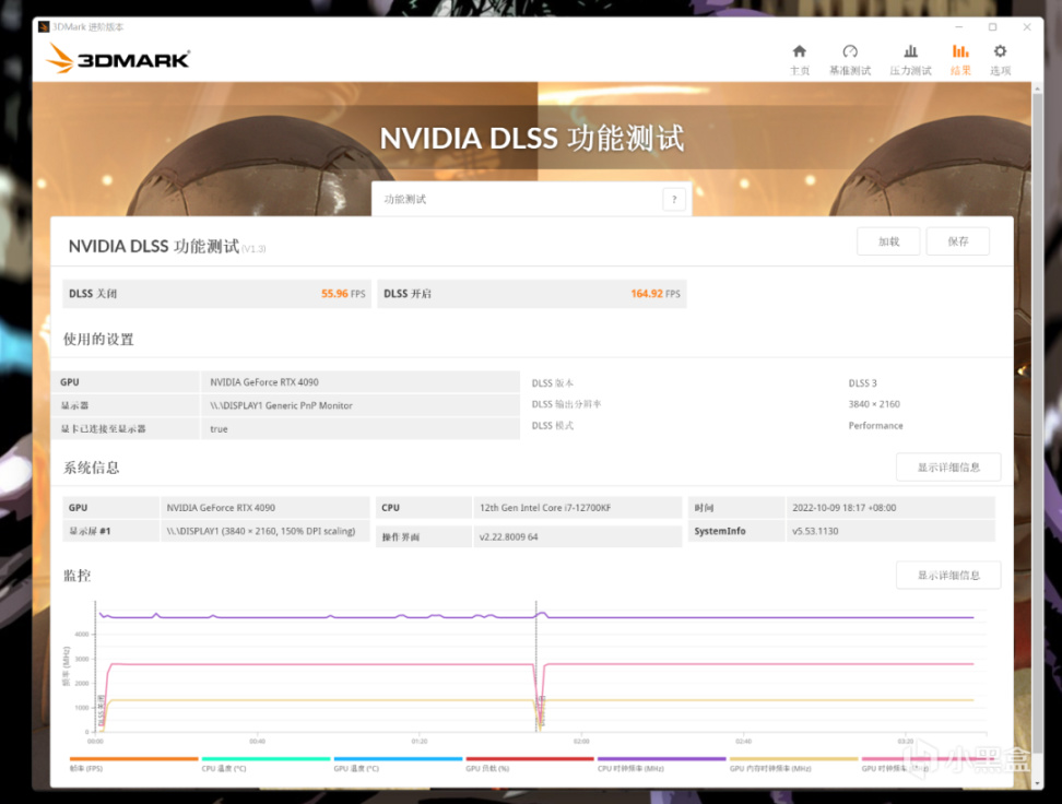 3Dmark DLSS Feature test:开启DLSS Performance模式实测164.92 FPS,与之形成对比的是关闭DLSS时仅有55.96FPS,开启DLSS可使FPS提升3倍左右。
