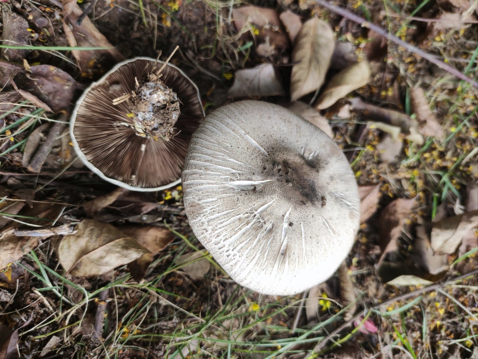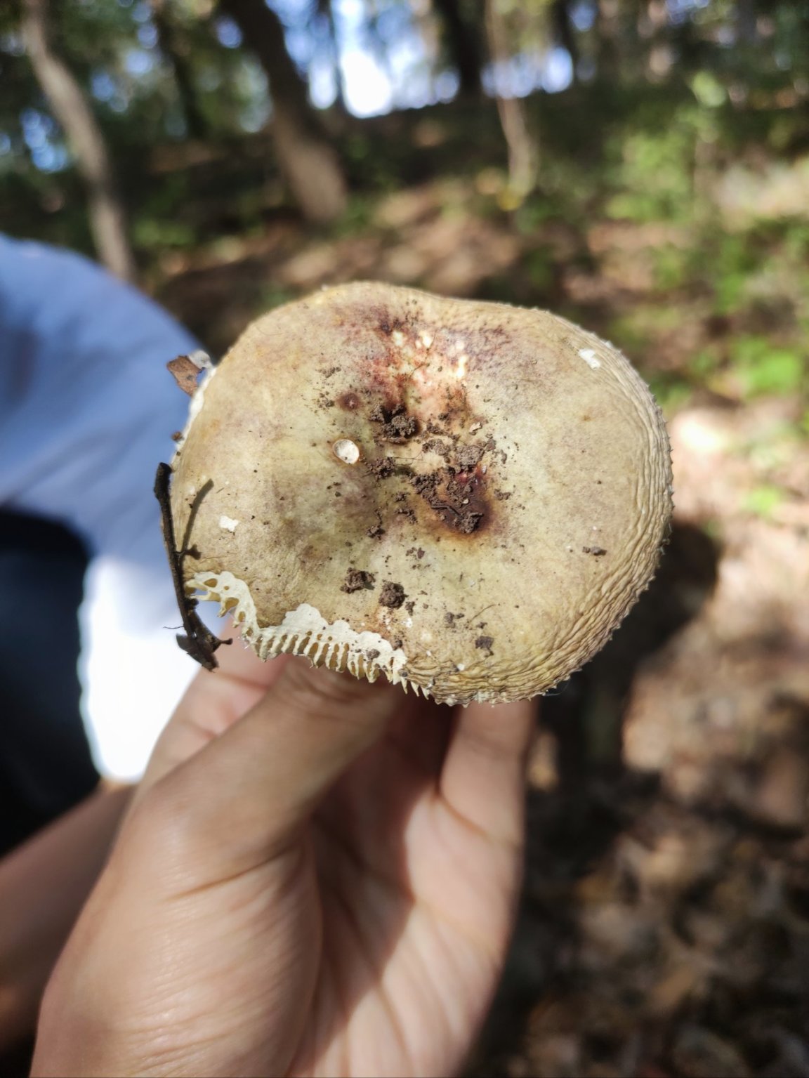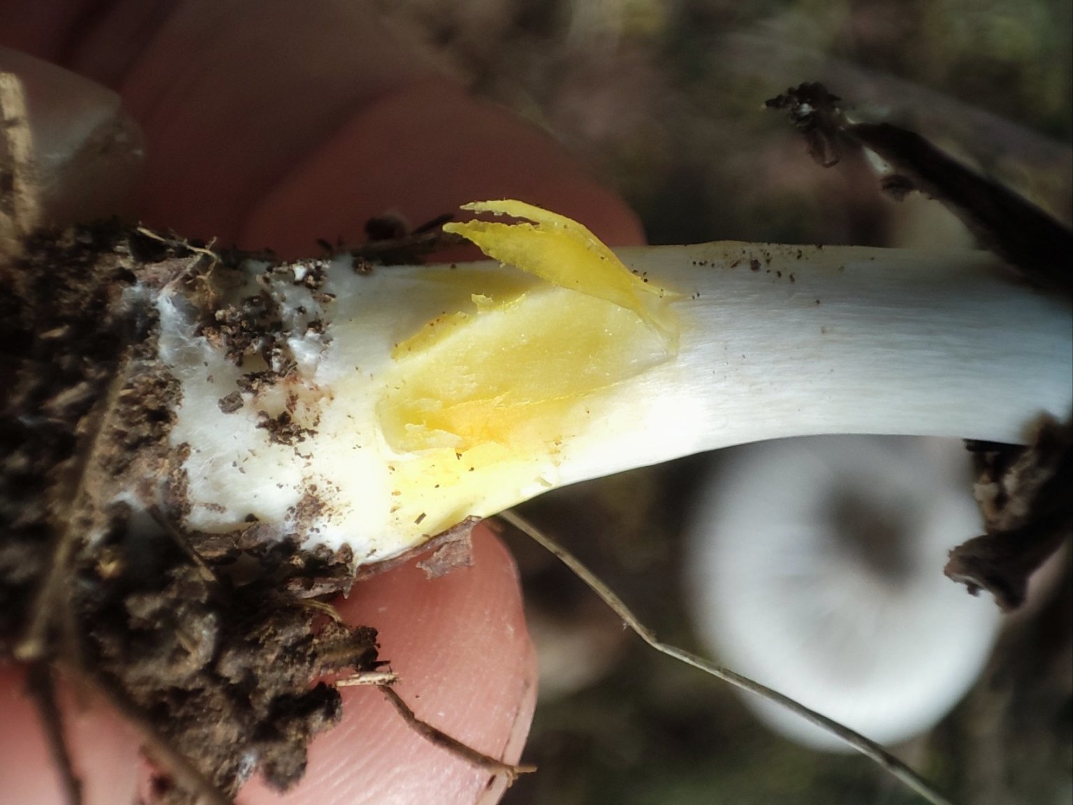 属于黄斑蘑菇组一类,特征是菌柄抠破以后会迅速变黄。这种会变黄的蘑菇基本上都有毒