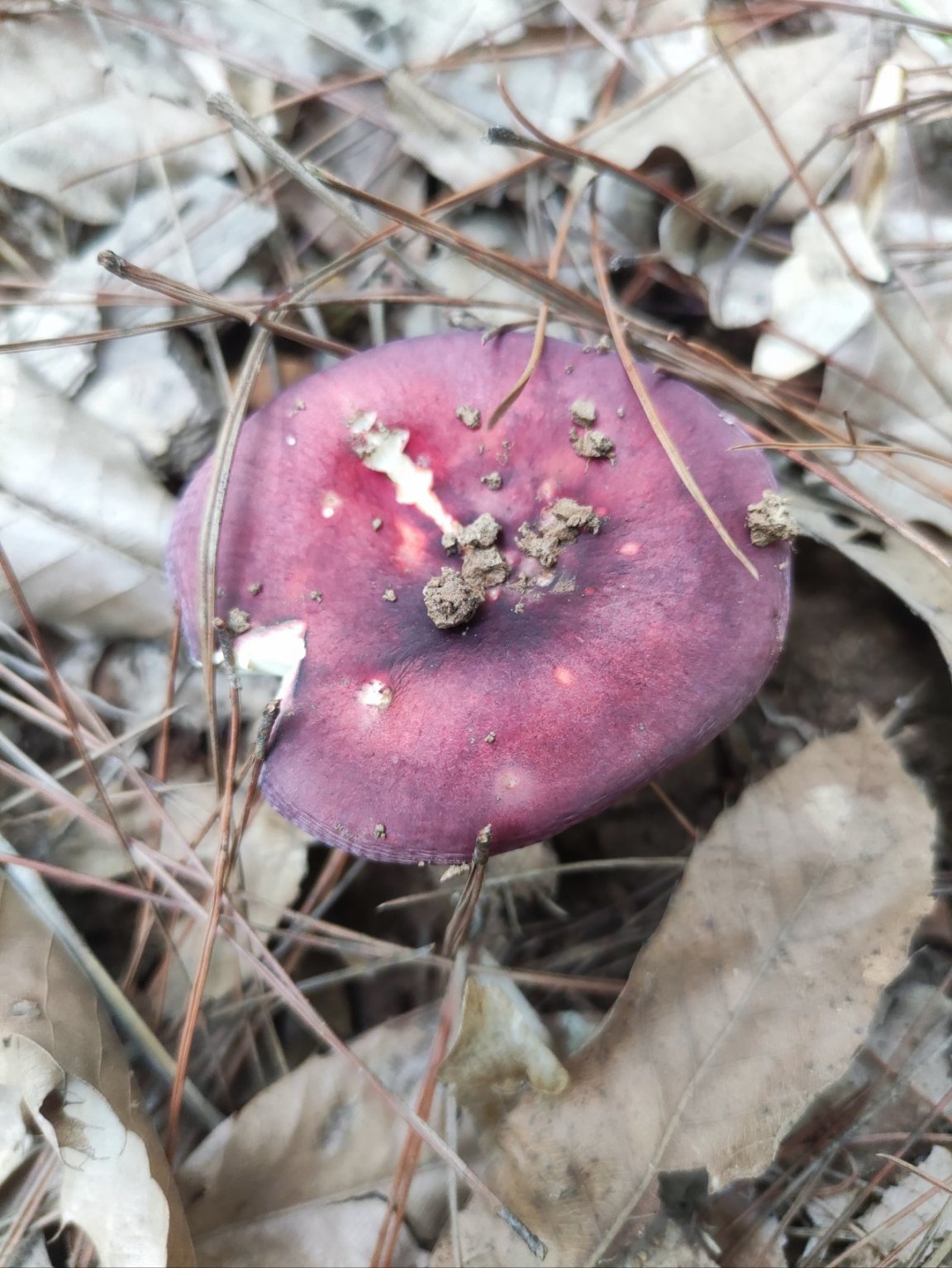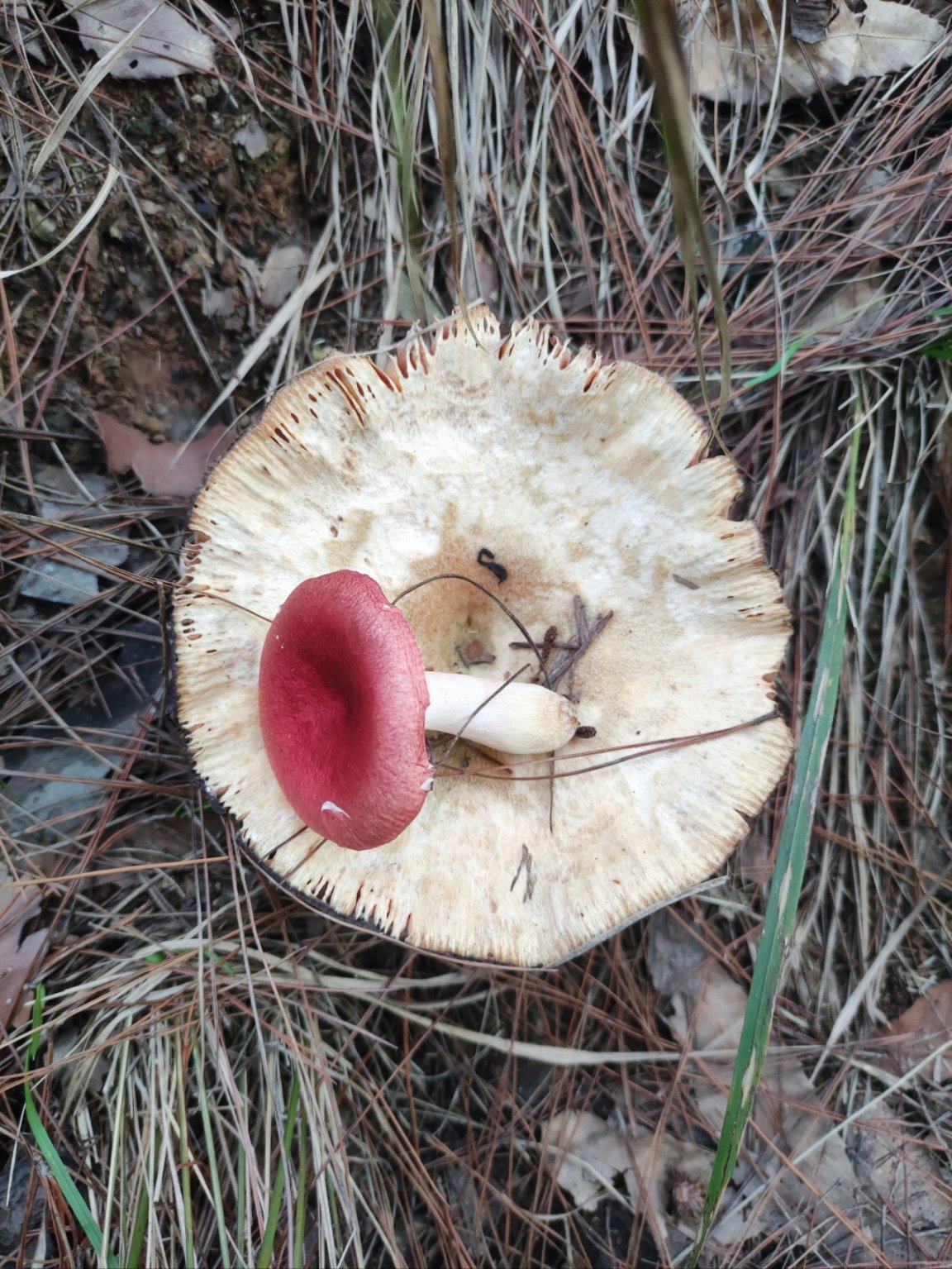 同一片林子里还有这种紫红色的蘑菇,跟上面鲜红色的毒红菇还是有区别的