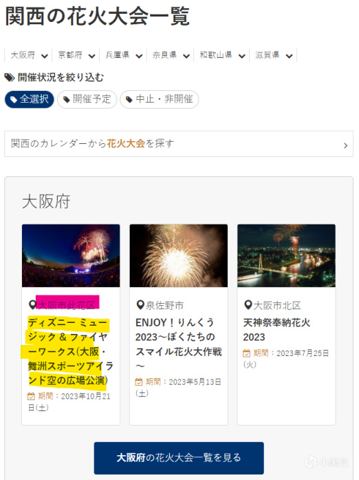 我们以关西(大阪、京都地区)为例,点击进入。然后会看到关西的不同地区举办的花火大会