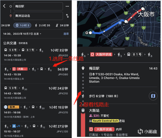 可以参考上文提到的的花火大会位置,然后用地图app(推荐google map)来导航:例如我的起始地为大阪的梅田,然后我导航到“大阪市此花区 / 舞洲スポーツアイランド”
