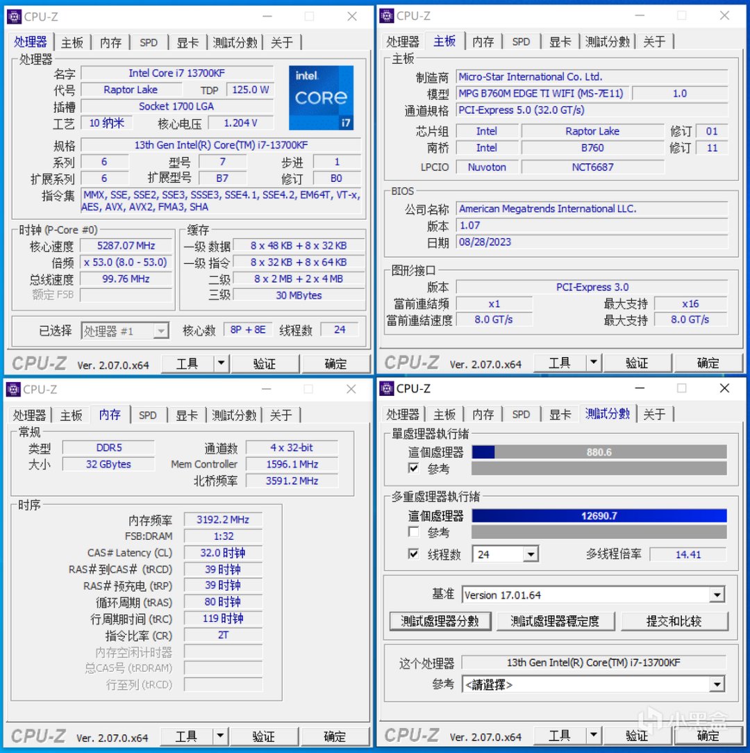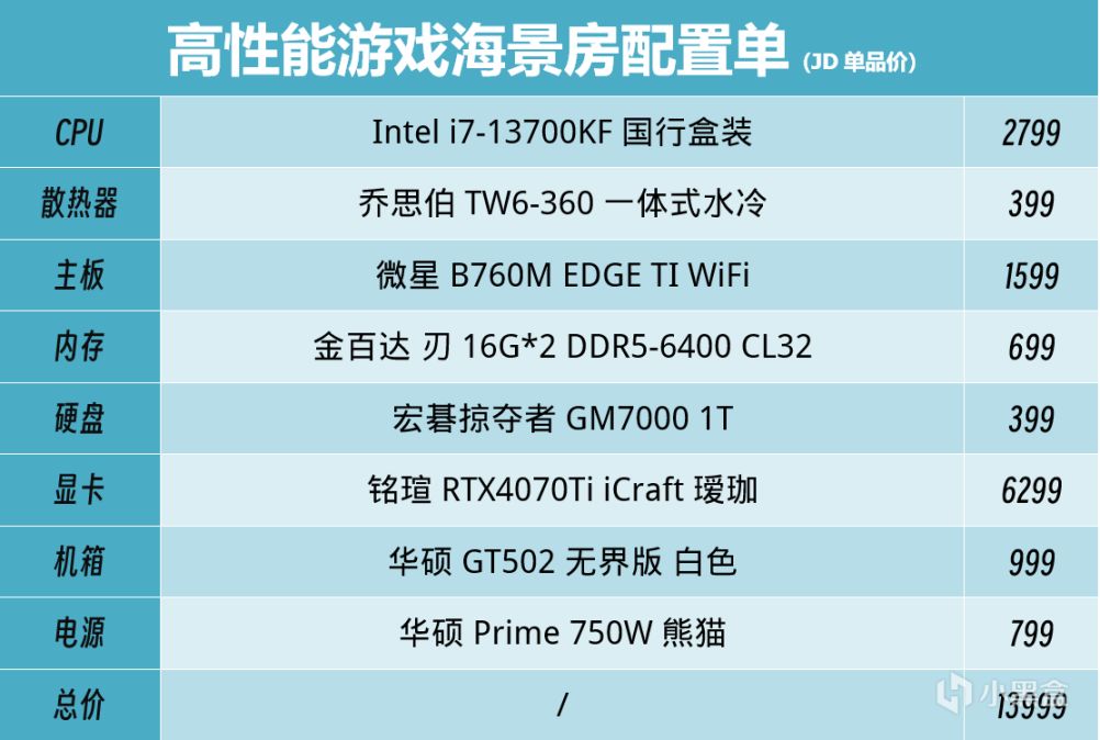 ▲考慮到第13代酷睿家族CPU i7和i9在大核數量上完全一致,區別只是i9多了8個效能小核並有着更高的睿頻頻率,但價格相比i7卻翻了接近一倍,性價比實在不高,而且對於遊戲應用來說,i7的性能都已經溢出了(新架構的威力太強了),殺雞又何必用牛刀?所以CPU是最能輕鬆敲定的——i7-13700KF,就是你了!