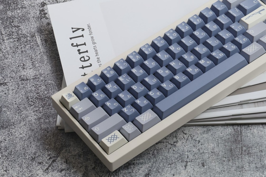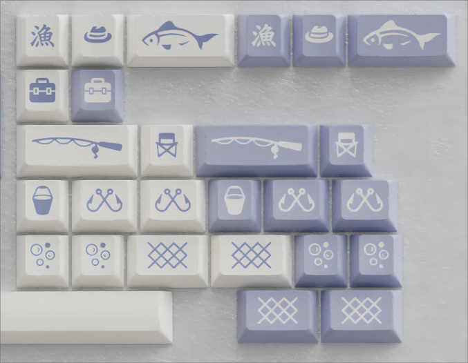 漁,是由Rifen日芬設計的一款藍色系鍵帽,靈感來源於一位愛魚的朋友以及一部電視劇集《深夜食堂》中愛喫魚鬆飯的女孩。Rifen也設計過不少有趣的作品,例如JTK西裝暴徒、夜櫻、莫比烏斯等,不過自從原廠漁之後就沒有再冒泡了,有點可惜。