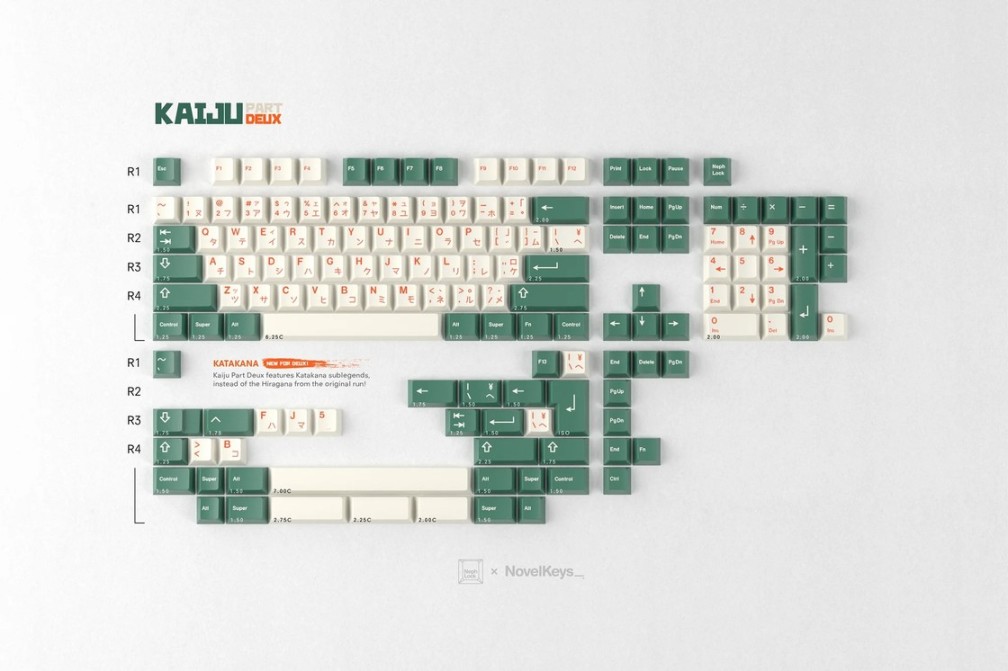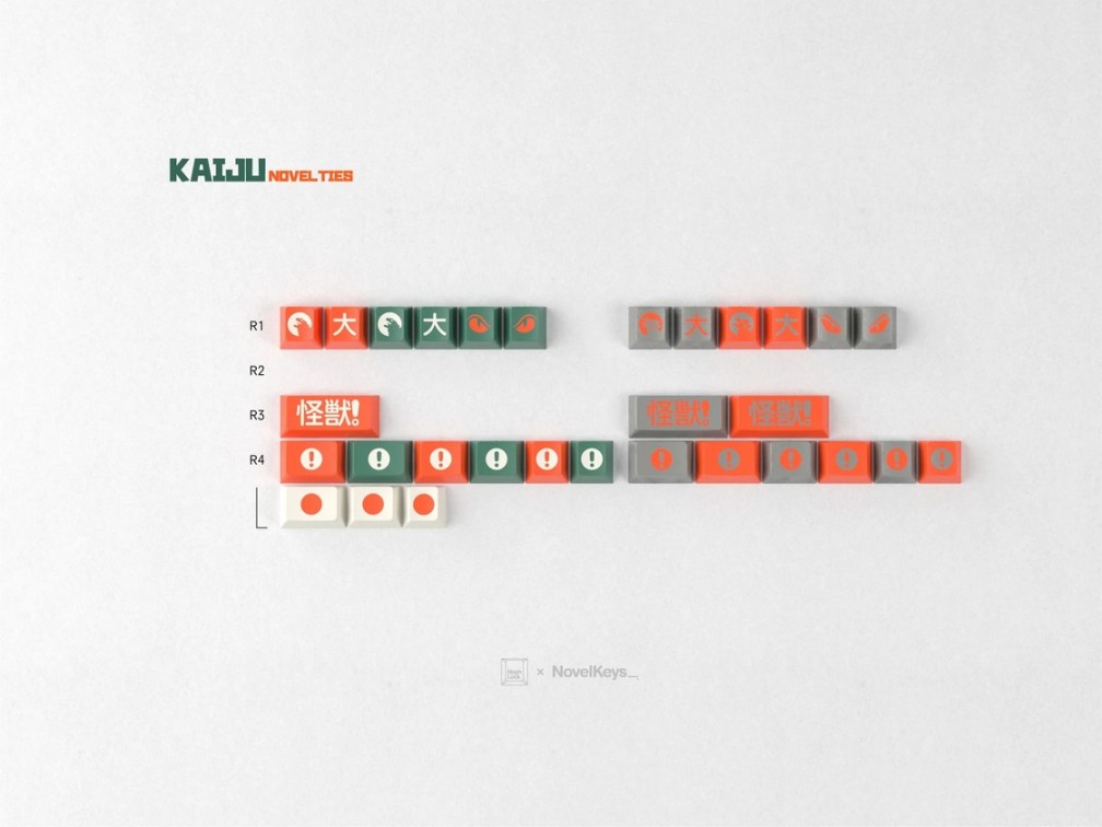 Kaiju(怪獣)可能在日語中意味着「奇獸」,但更常用來指代大型怪獸。這套鍵帽靈感來自於經典的日本怪獸電影,這些電影中經常出現「大蜥蜴」怪獸(哥斯拉)