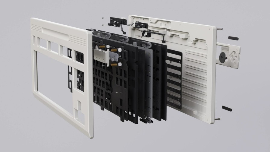 配色靈感來自與這一主題相關的各種元素。深綠色的mod區,來自經典“大怪獸”的神祕色彩,與火紅色的字符形成了鮮明的對比。這兩種顏色與淺米色的基底相搭配,致敬經典的防禦終端。