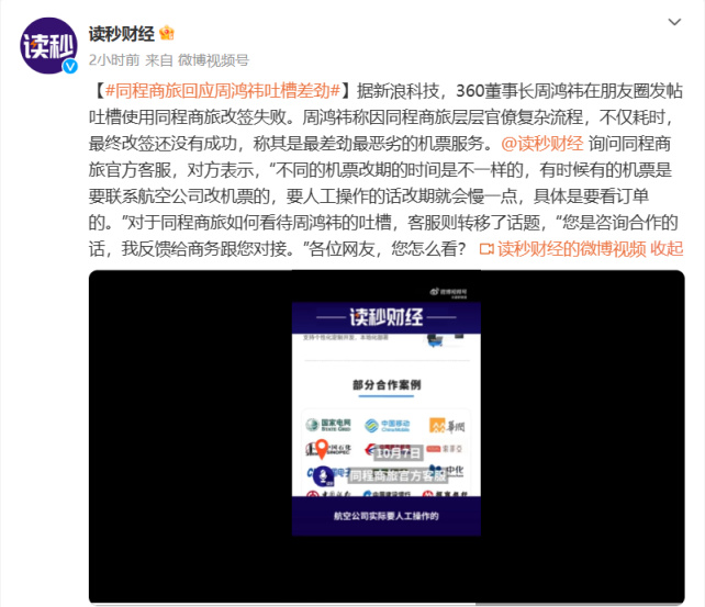 据老板联播报道,同程商旅客服表示非常重视,专员当时是按照流程正常处理的,不是什么官僚。客服还表示,当时是没有座位没有选成功,周鸿祎改签失败最后退票。