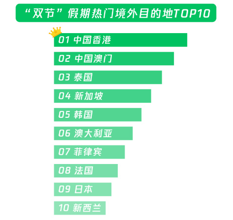 “双节”假期热门境外目的地TOP10为:中国香港、中国澳门、泰国、新加坡、韩国、澳大利亚、菲律宾、法国、日本、新西兰。