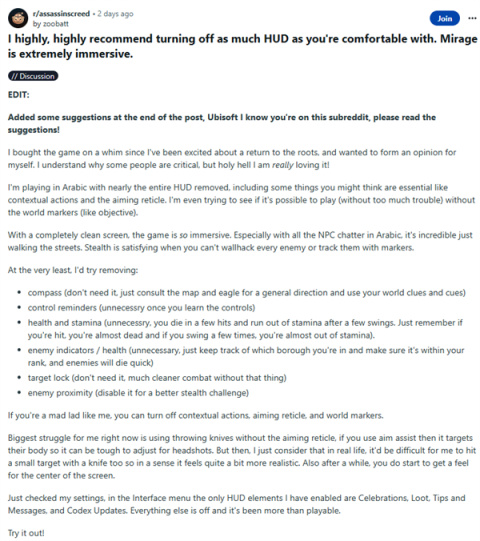 近日在Reddit论坛中,有博主建议在游玩《刺客信条幻景(Assassins Creed Mirage)》时尽可能多的关闭HUD,这将会使游戏极其身临其境。