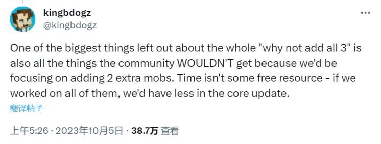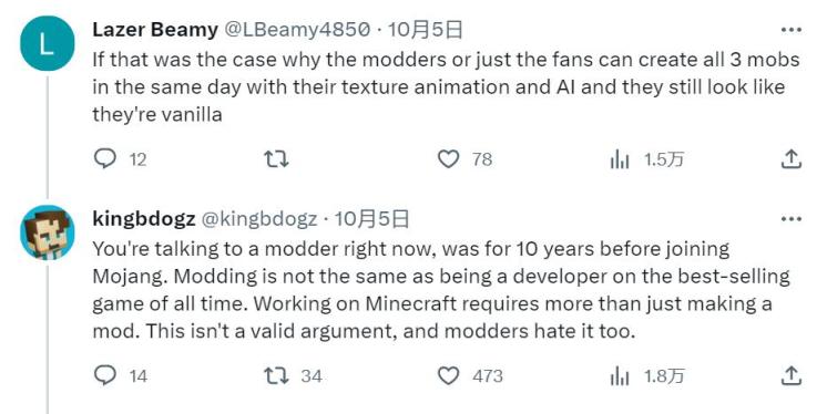 还有玩家追问说,为啥mod作者一天就能把这些新生物做出来,而Mojang却不行呢?kingbdogz表示,他本人以前就做过10年mod(他是以太mod的作者),开发mod跟开发《我的世界》完全没法相提并论,所以这种对比是没有意义的,mod作者们也讨厌这种对比。