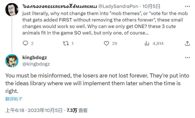这三种新生物不仅能点缀《我的世界》的游戏世界,也能提供一些实用效果,因此有不少玩家希望能“全都要”,他们不理解:Mojang为啥不能把三种生物全部加入游戏?对此,Mojang开发者kingbdogz做出了解释:这三种新生物并非下次更新的核心内容,只是个添头;如果全部加入游戏,就会影响到其它新内容的开发,最终玩家会失去一些其它的新东西。