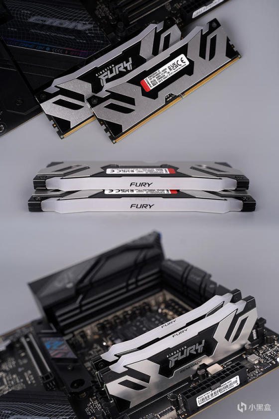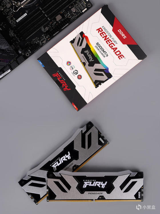 搭配内存选用的是金士顿 FURY Renegade 叛逆者系列 ARGB DDR5 6000 16G×2,包装正面印刷有内存本体展示,搭配本体的线条图案修饰,FURY LOGO,对应的规格等信息。本体采用矮马甲高兼容设计,外观主体采用黑色,两侧银色图案装饰条修饰,呼应散热马甲造型,两侧 FURY 相关标识文字点缀。