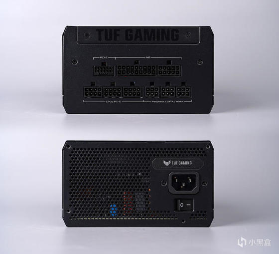 模组接口部分,配有文字示意,给到一个原生 16PIN PCIE 供电接口、常规 PCIE 和 CPU 8PIN 供接口则为通用设计 ( 合计 3 组 )、 3 组 6PIN PERIPHERAL/SATA/MOLEX 供电接口、主板 24PIN 合二为一两组;电源尾部,TUF 铭牌点缀,标准电饭锅三插孔,搭配 AC 开关,一侧大面积开孔出风设计。