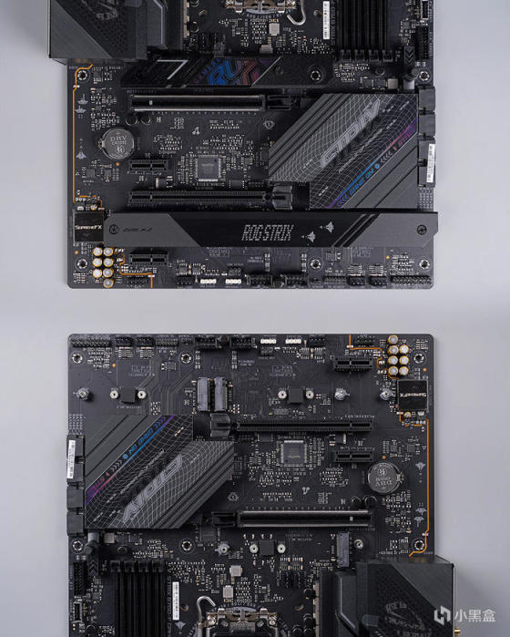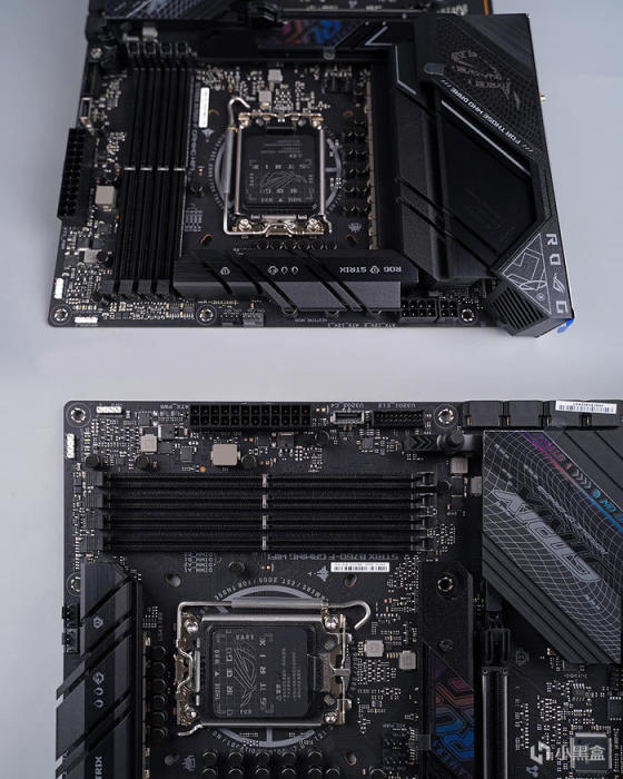 主板外观,采用标准 ATX 版型规格,采用黑灰色外观设计,大面积的散热马甲模块覆盖,表面败家眼及相关文字标识图案点缀,整体电竞感满满,另主板背面还带有 STRIX 图案修饰。
