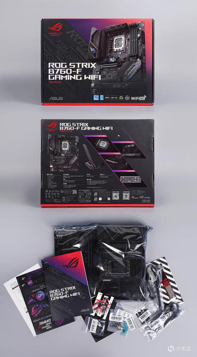 华硕 ROG STRIX B760-F GAMING WIFI 主板,降低门槛的败家之眼 ROG STRIX 系列,价位相比亲民一些,定位电竞游戏玩家,包装正面搭配主板本体展示,烫印的型号示意,左上角 ROG LOGO ,左下角 ASUS LOGO,一旁则是一堆的图案标识,13th CORE、B760、DDR5、LGA 1700、PCIe 5.0、AURA SYNC、WiFi 6E;给到的附件比较的丰富, ROG 信仰贴纸、说明书、ROG入会卡片、钥匙扣、WIFI 天线、M.2 螺丝卡扣及垫片、SATA 数据线、装机扎带、散热贴等。
