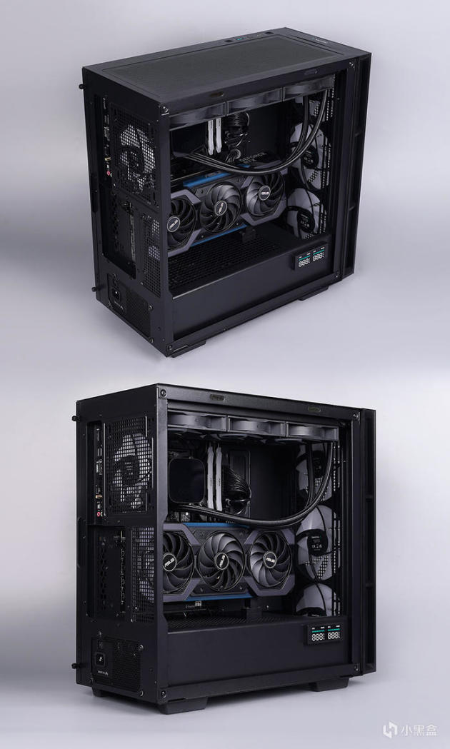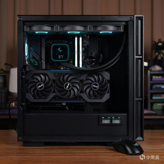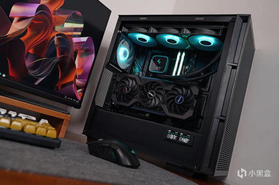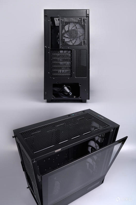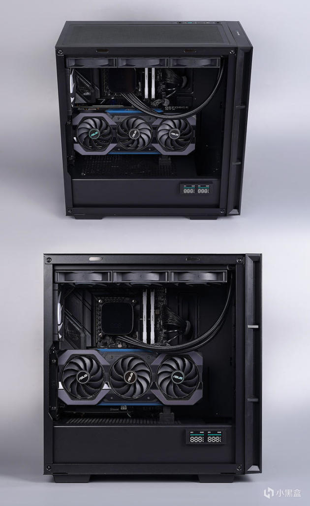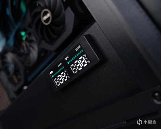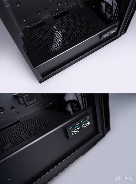 电源仓顶部带有散热开孔设计,可支持安装两个 120 风扇。数显屏幕位于电源仓一侧,需通过 USB 2.0 连接主板,搭配自家的软件,能让玩家实时掌握 CPU 和 GPU 的温度和使用率,且配备有高温提醒功能,也使得机箱有着不一样的视觉效果。