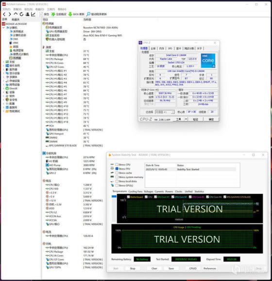 双烤测试,同样也是 20 分钟左右,CPU P-CORE 温度最大值 87°C,E-CORE 温度最大值 76°C,显示功耗 180W 左右,显卡核心温度 56.9°C(结温 67.3°C),那么以上就是这次装机秀的全部内容了,如上所述仅代表个人观点,仅供参考!谢谢您的浏览!欢迎大家留言交流!