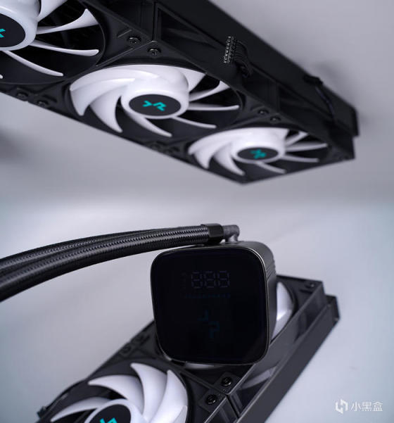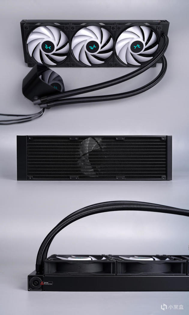 散热本体采用通体黑色外观设计,水管官标长度 410mm,采用进口的 EPDM 高密封材料,喜闻乐见蛇皮网包裹保护,提升质感,黑白色 ARGB 风扇,预装在冷排上面。冷排目测有 14 条的水道,整体做工还不错,漆面平整,给到的散热鳍片蛮整齐的。水管与冷排的接入端,位置上标配有九州风神独有的泄压装置, ANTI-LEAK 动态平衡技术,在冷排内增置泄压囊,通过压差改变冷液容积,使内部增加的压力得到释放,从而避免高压漏液的风险。