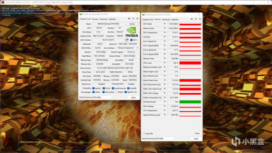 FURMARK 满载测试,过程 20 分钟左右,华硕 ATS 巨齿鲨 GEFORCE RTX 4060 O8G GAMING,GPU 频率 1800MHz 上下,显存 2125MHz 上下,核心温度 57°C(结温 67.8°C),显示功耗 115W 左右。