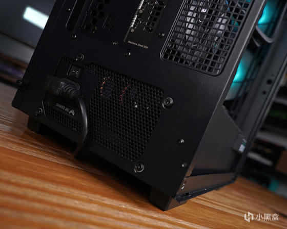 机箱右侧封闭式面板,背线出厂给到的线材有点过于飞扬,上沿 PCB 为灯光模块,可用来安装拓展及控制 RGB,主板区域大开孔设计,下沿带有两个 2.5 寸 SSD 安装孔位,底部硬件支架,可以支持两块 3.5 寸 HDD,另支持两档位置调整,以适配更长的电源安装,对应底部采用磁吸式的防尘网。