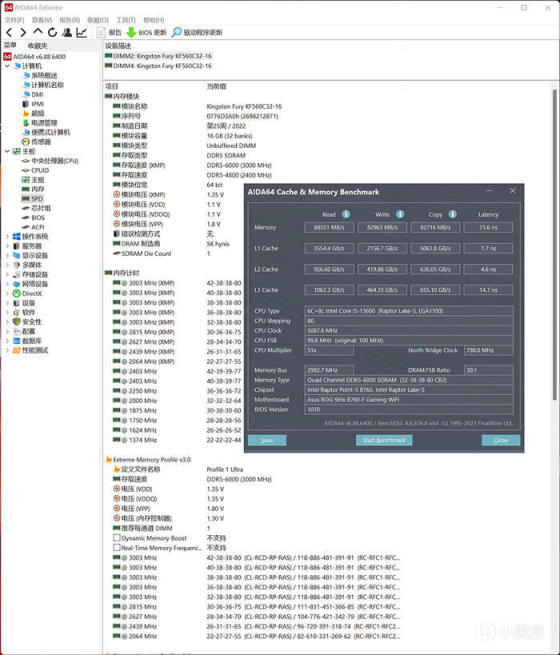 金士顿 FURY Renegade 叛逆者系列 ARGB DDR5 6400HZ 16G×2 内存 AIDA64 跑分表现。