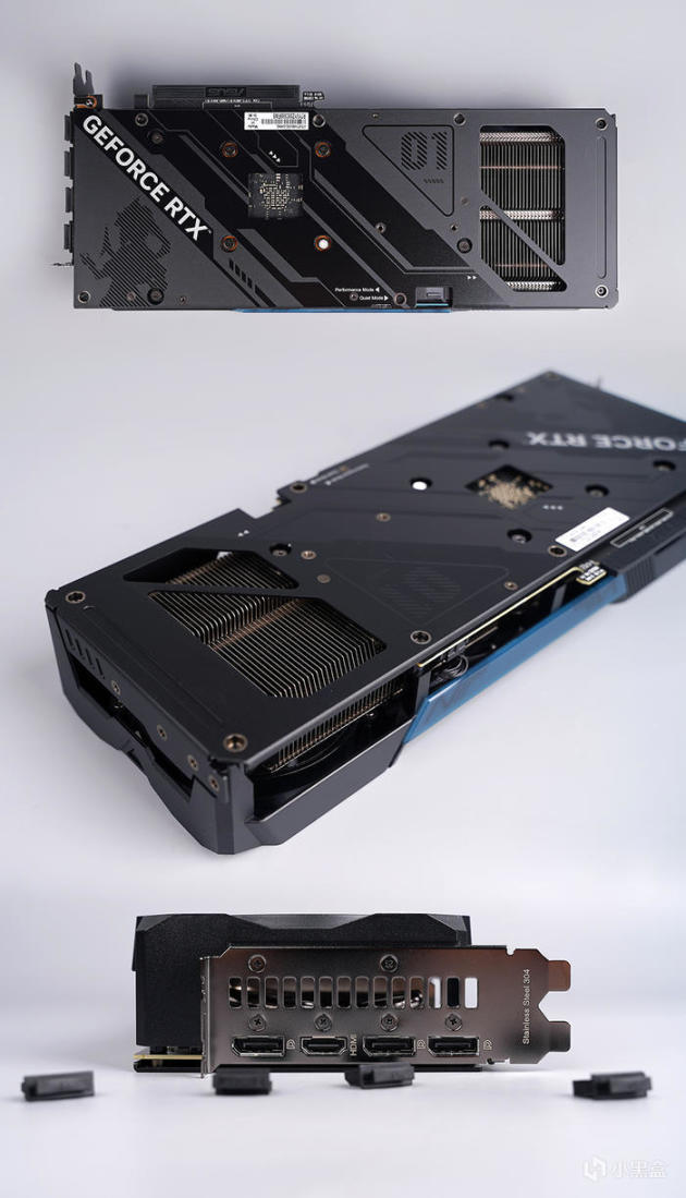 显卡配备坚固的全金属背板,表面相关元素图案修饰,且金属背板设计有进气格栅,同轴流风扇协同工作,降低显卡温度,保证较低的噪声水平。显卡整体为 2.7 槽厚度,PCI 挡板材质为华硕显卡喜闻乐见的 304 不锈钢( 抗衰老 ),输出接口方面,提供了三个 DP1.4a 和一个 HDMI 2.1 接口。