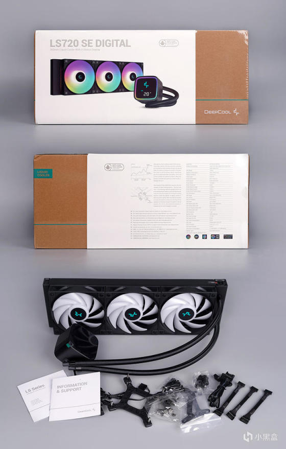九州风神 DEEPCOOL 冰堡垒 360 青春数显版,包装采用简约风格设计,抽拉形式,内牛皮纸外套白底产品外观展示,标注型号 LS720 SE DIGITAL 英文标注规格及属性,右上角 ANTI-LEAK LOGO,为自家的泄压防漏液技术标识,则是产品该项技术的图文示意寿命及其它的规格参数,另标注有各大主板厂商灯光标识,支持搞一起灯光同步。平台支持 LGA 1700/1200/115X 和 AM5/AM4。