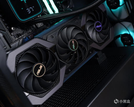 显卡两侧采用大面积的外露式鳍片设计,增加进出风规模,加强散热效能,鳍片做工非常的工整,居中冰蓝色装饰条,居中 ASUS LOGO 修饰,右上角 GEFORCE RTX 标注。