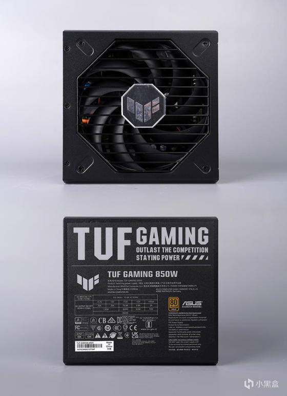 风扇位置,采用八边形镂空设计,对应形状的钢丝风扇罩及轴心 TUF 装饰标志,风扇采用 135mm 双滚珠轴承的轴流风扇,有着更好的散热及静音表现,另值得一提的是内 PCB 采用保护性涂层设计,更具耐用性,不惧潮湿天气,还有小强乱入,对应另外一面规格贴标,80PLUS 金牌认证,+5V 和 +3.3V 输出电流 25A,合计输出 130W,+12V 输出电流 70.8A,提供最大 850W 的功率,其它方面,带有 OPP/OVP/UVP/SCP/OCP/OTP 保护功能,采用低 ESR 日系电容可提升效率并减少发热源,降低噪音以及提高可靠性与稳定性,另获得了 iST 宜特检测实验室多项测试认证。